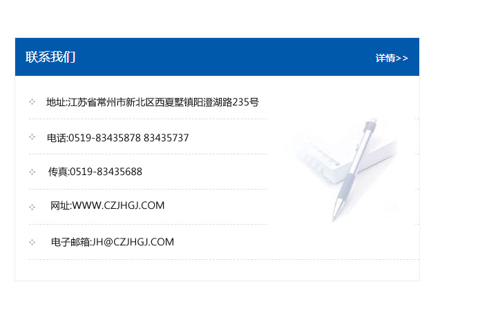 地址:常州市新北區友邦商務大廈1幢16、17層  電話:0519-85101652  傳真:0519-85112595  郵編:213022  網址:www.cz-jiayue_cn.cxqingfu.com  郵箱:xiajifengaa@163.com